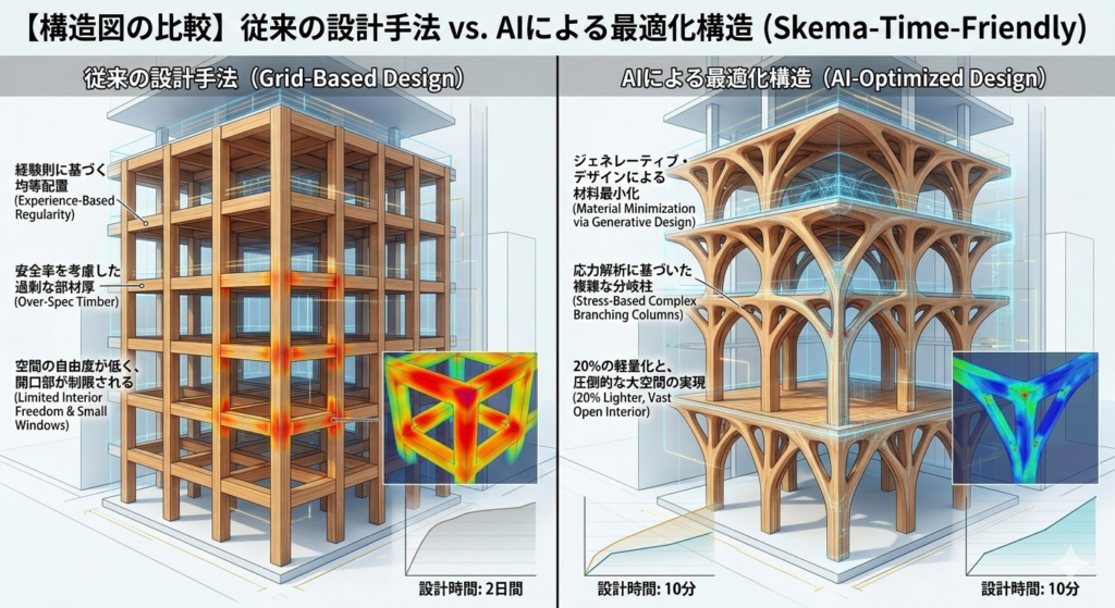 構造解析AIが導き出す「トポロジー最適化」の真実や、ジェネレーティブ・デザインがもたらす新しい美学を、実例とともに深掘りします。 - 数字で語る「木造の経済学」
