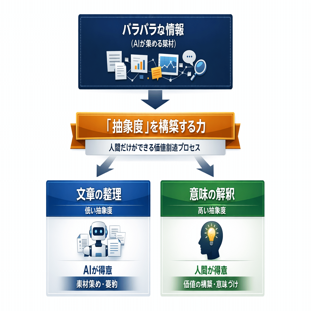 - AIは素材集め:要約やデータ収集など、抽象度の低い作業をAIに丸投げする 。