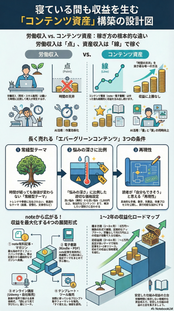 本記事では、一度作れば自分が動かなくても収益を生み続ける「コンテンツ資産」の設計方法を、具体的なロードマップとAI活用法を交えて解説します。