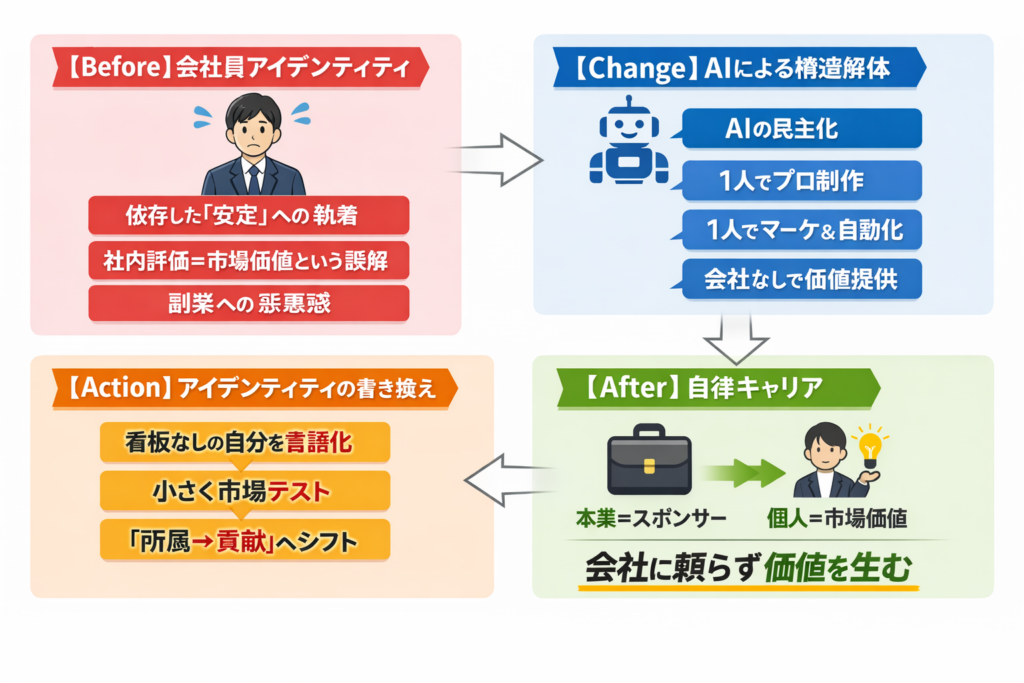 「会社員」というアイデンティティを手放す日|AI時代に個人として稼ぐ3つのステップ
