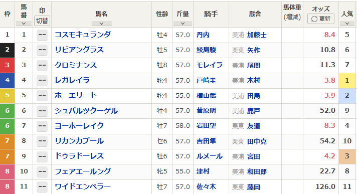 - 3 クロミナンス (牡8, モレイラ, 尾関知人調教師, 単勝10.8倍・7人気): ロードカナロア産駒。X上で予想家から推しが多く、堅実な善戦マン。モレイラ騎乗で一変の可能性。