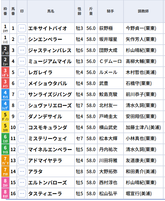 - △ ジャスティンパレス: 古豪実績で穴。調教A評価で好枠想定の粘り。