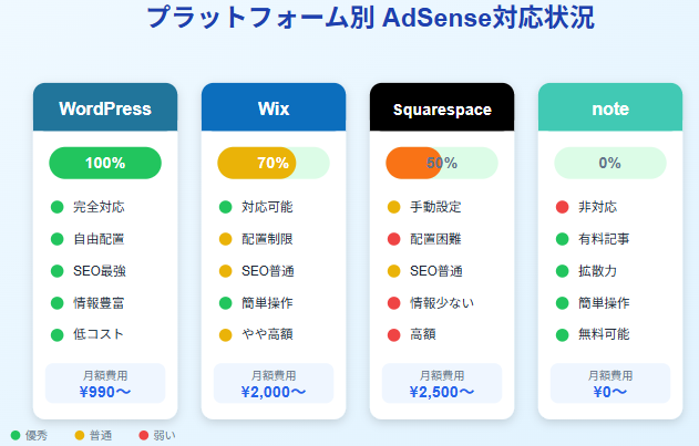 本記事では、WordPress、Wix、Squarespace、そしてnoteという4つの主要プラットフォームを、AdSense収益化の観点から徹底比較します。