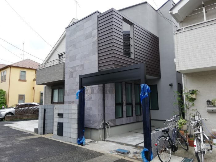 TATSUMI PLANNING 完成 外構完成 外構 駐車場 足場撤去7 足場カバー 架構組み立て 木材搬入 基礎コンクリート 基礎鉄筋 更地