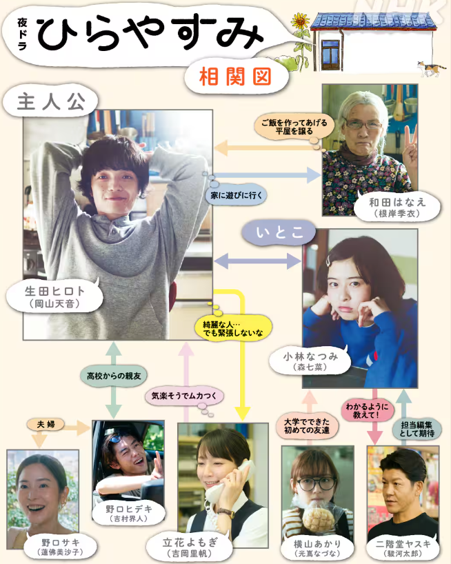 生田ヒロト(岡山天音)、29歳、フリーター。元俳優で、いまは定職なし、恋人なし、普通ならあるはずの?将来の不安も一切ない、お気楽な自由人です。そんな彼は、人柄のよさだけで、仲良くなった近所のおばあちゃん・和田はなえから、一戸建ての平屋を譲り受けることに。そして、山形から上京してきた18歳のいとこ・小林なつみ(森七菜)と2人暮らしを始めました。不動産会社勤務で仕事熱心な立花よもぎ(吉岡里帆)をはじめ、彼の周りには生きづらい“悩み”を抱えた人々がいつのまにか集まってくる。