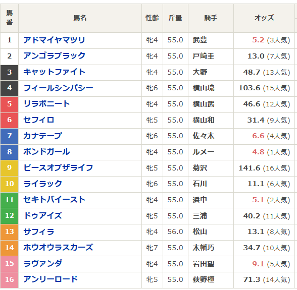 - • 4 リラボニート (牝5, 古川吉洋, 田中勝春調教師, 単勝47.9倍・10人気): ディープインパクト産駒。大穴だが、調教次第で一変。