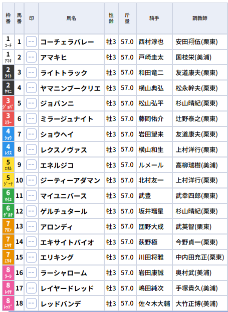 - 18 レッドバンデ (牡3, 佐々木大輔, 大竹正博調教師, 8枠18番, 単勝25.0倍・9人気): キズナ産駒。外枠不利だがスタミナ豊富、やや重で穴。