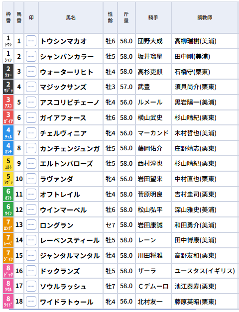枠順:ジャンタルマンタルが7枠15番、ソウルラッシュが8枠17番。外めながら、過去このレースでは「7〜8枠」の好走例あり。 ネット競馬
