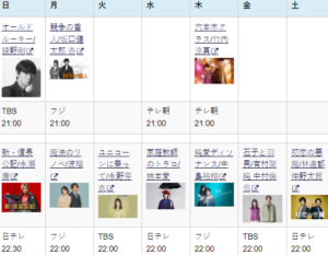| 日テレ 22:30 | フジ 22:00 ★ | TBS 22:00 | 日テレ 22:00 ★ | フジ 22:00 | TBS 22:00 ★ | 日テレ 22:00 ★ |