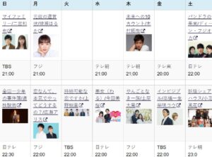 | TBS 21:00 | フジ 21:00 | テレ朝 21:00 | テレ朝 20:00 | テレ東 20:00 | 日テレ 22:00 |