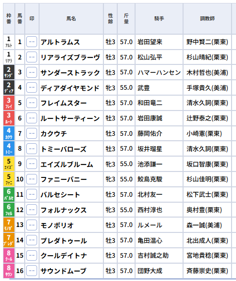 対抗は全データ該当の4番ディアダイヤモンド。3着候補は最内枠の1番アルトラムス。穴馬として唯一の2勝馬クールデイトナとハイペース耐性のサウンドムーブ。