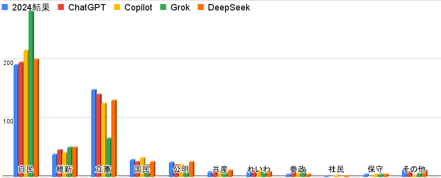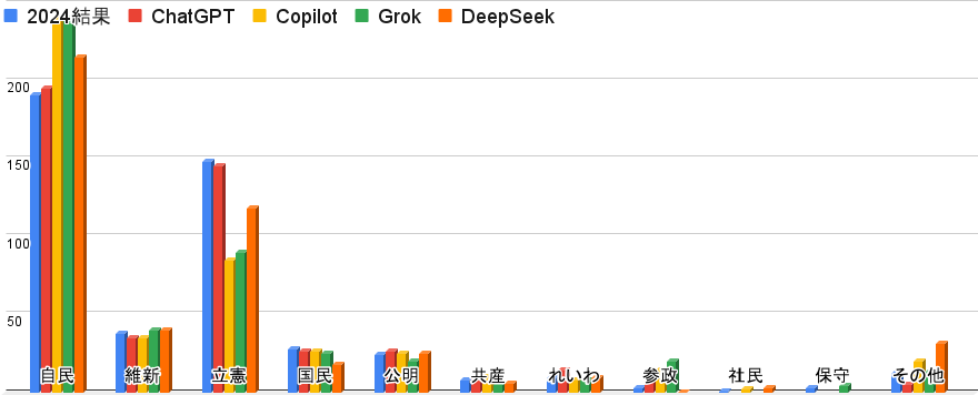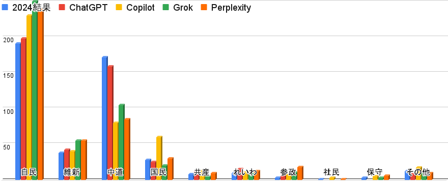 2024年10月の衆院選結果(自民191/立憲148/維新38/公明24/国民28/れいわ9/共産8/参政3 など)を起点に、各AIは2025年以降の世論調査や参院選の傾向を踏まえて「もし今、または近い将来に総選挙があったら」という前提で議席数を試算しています。