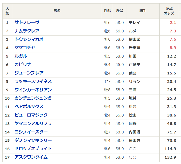 - ○ 6 ナムラクレア: G1実績抜群。ルメールで安定。