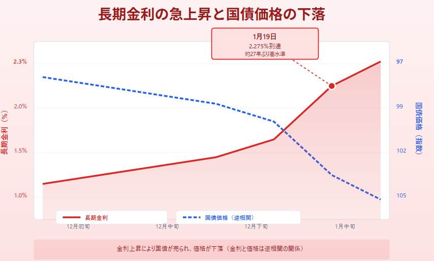 最も深刻な反応は金融市場で見られました。2026年1月19日、長期金利の指標となる新発10年物国債の利回りは一時2.275%まで上昇し、1999年2月以来約27年ぶりの高水準を記録しました。