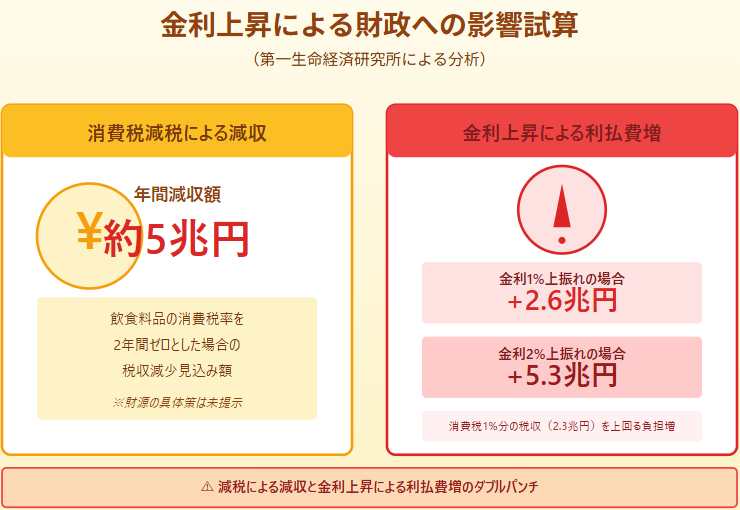 これは消費税1%分の税収(約2.3兆円)を大きく上回る金額であり、税収の上振れ分が金利上昇による利払費増で相殺されるリスクがあります。「金利のある世界」では、政治の常識が経済の非常識であってはならないという警告が発せられています。