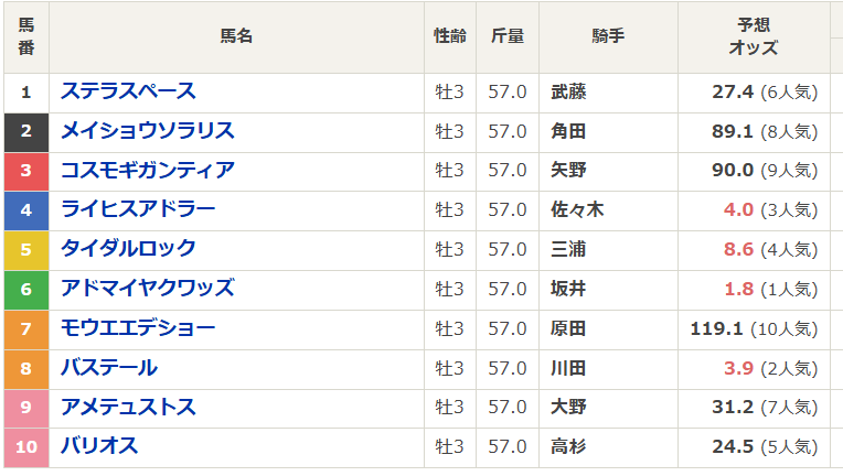 出走はアドマイヤクワッズ、ステラスペース、アメテュストス、タイダルロックなど10頭前後の想定で、極端な多頭数ではない構成です。